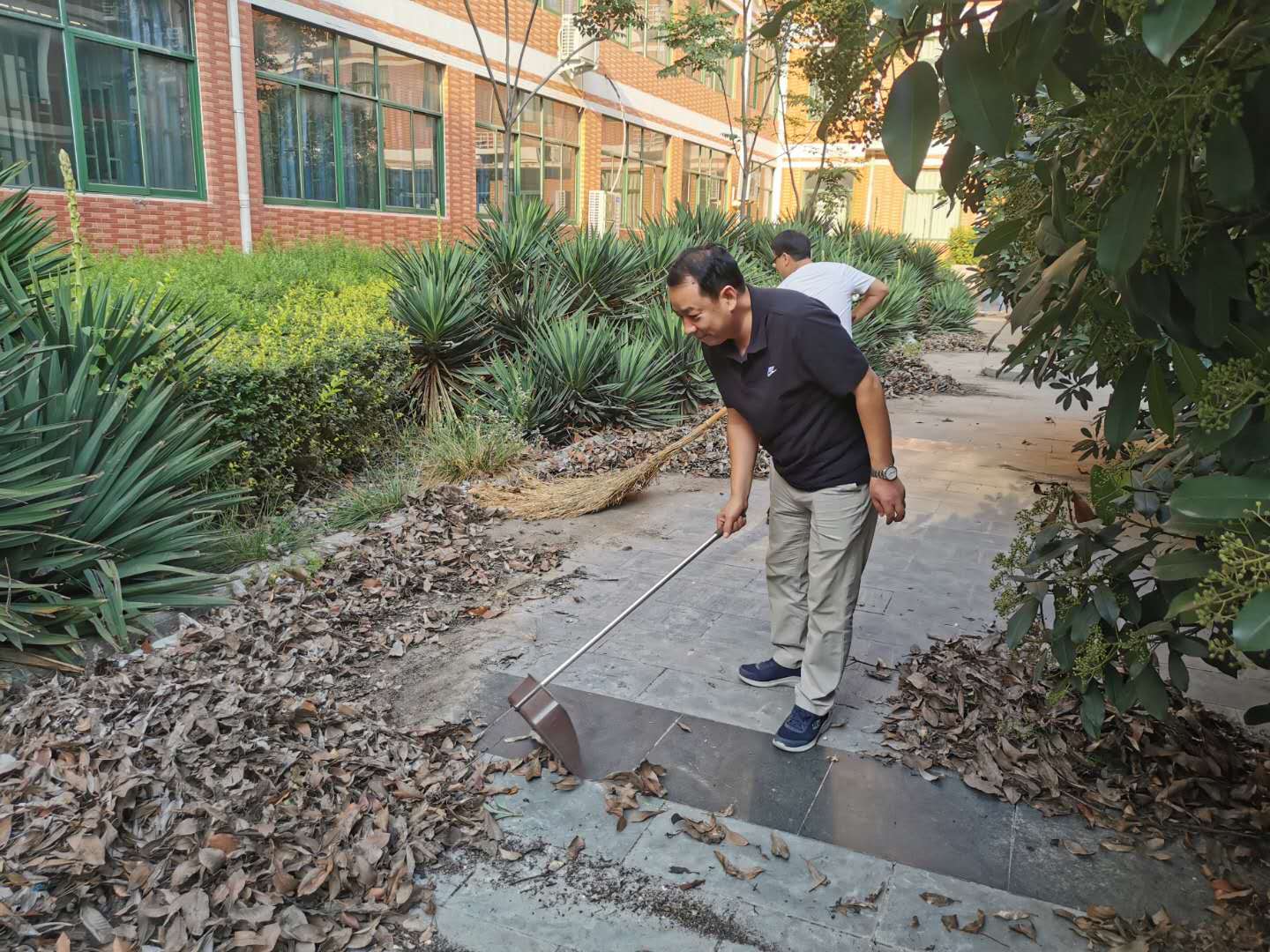 beats365中文官网教师在公司党委书记张胜利和经理李金玉的带领下,科学分工协作,对A01号楼和A02号楼中间天井的环境进行清扫。由于疫情原因,天井的卫生长期没有打扫。地面上各种荒草丛生,厚厚的灰尘到处都是,树底下、草丛中随处都是已经腐烂变霉的枯叶,打扫起来,难度很大。面对困难,大家毫不畏惧。树丛矮小,大家就钻到树下,用笤帚扫、用耙子扒、用簸箕铲,把枯叶一片一片扒拉出来;没有铲子,就用手一根一根地拔地面上的荒草;尽管灰尘飘满了脸颊、野草划破了双手、垃圾弄脏了衣服,大家毫不在意。经过近两个小时的奋战,整个天井被打扫得干干净净、焕然一新。
