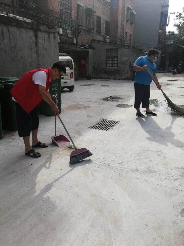 8月21日下午公司党委书记张胜利、副书记黄远伟带领教师志愿者到公司帮扶单位——中原东路社区统建楼家属院,继续开展帮扶活动,将庭院的卫生进行了巩固和维护。