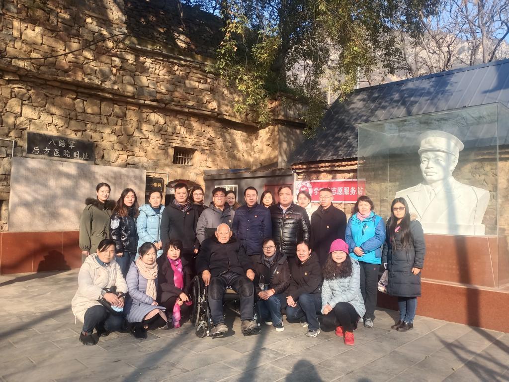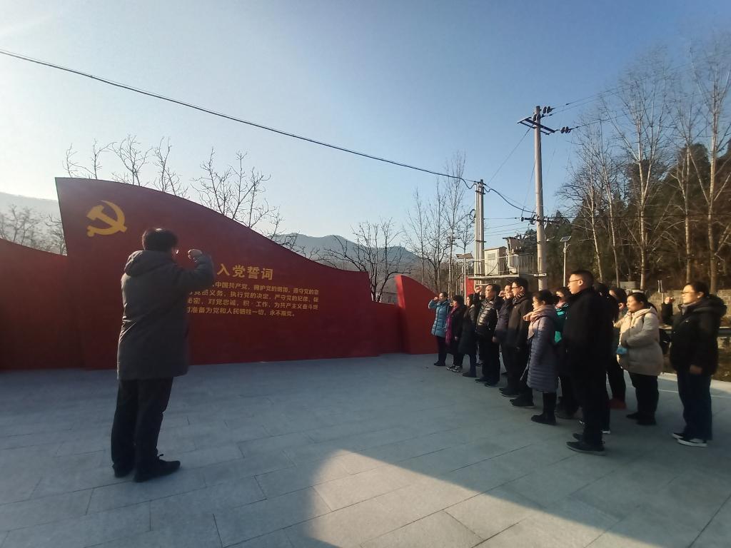 在随后的现场教学中,公司党员干部陆续参观了抗日英雄董天知纪念馆、皮徐支队作战小道、八路军抗战后方医院。在八路军后方医院旧址,93岁的原八路军儿童团团长慎天才老人给公司党员干部深情讲述了抗战时期的传奇故事,将大家带回了烽火连天的抗战岁月:1944年4月,皮定钧司令员和徐子荣政委率领八路军豫西抗日先遣队来到荥阳庙子乡,与敌人展开了激烈的战斗,并最终取得了胜利,但也有许多英勇的战士在战斗中受伤。为了救治伤员,就临时建起了一个抗日后方医院。医院以一棵古橿树作为掩护,在树下建了三孔窑洞,分别住有轻、重伤病员和院部医护人员,皮定钧司令员曾多次亲临病房探视慰问。无数英雄来过这里,无数英雄从这里走出,转战南北,直至全国取得胜利。窑洞的房顶上这棵生命力十分顽强的古橿树,是中原地区的稀有树种之一。这棵古树也在这里历经几世沧桑仍树木峥嵘,枝繁叶茂,有效地隐蔽了医院,保护了一批又一批伤员脱离险境,是名副其实的“英雄树”,也形成了顽强的古橿精神。 公司党员干部在接受精神的洗礼后,在宣誓广场由公司党委书记张胜利带领全体党员重温入党誓词,继承先烈精神。