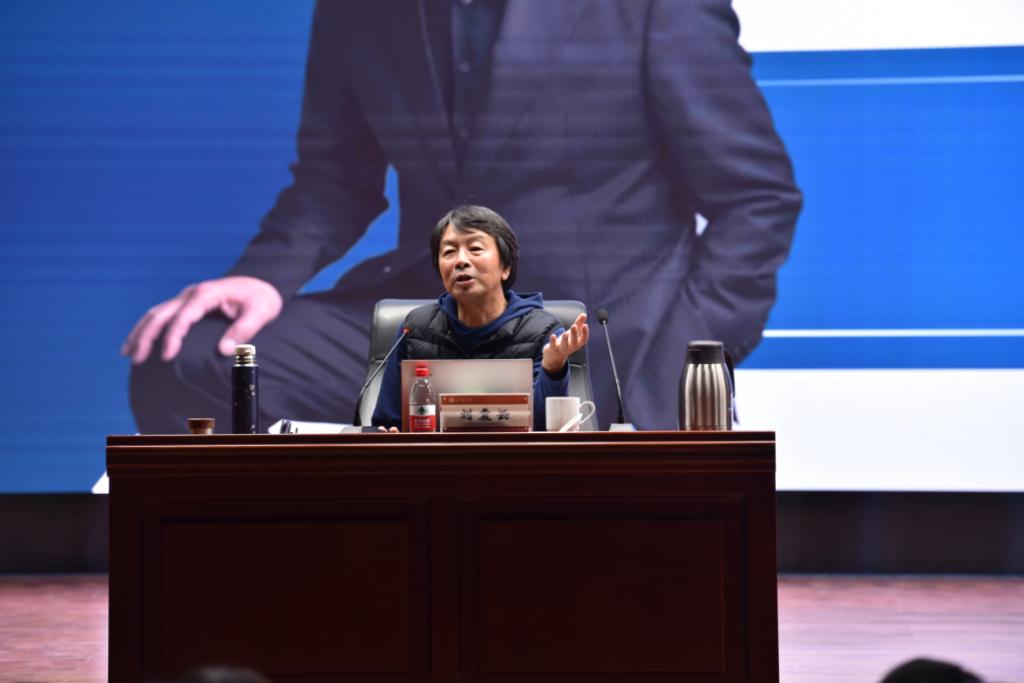 刘震云首先讲述了文学与生活的关系。他说,文学来自生活,远离生活的人是不可能创造出文学作品的,只有扎根生活,熟悉生活,才能发现好的题材,写出好的作品。他生在延津,长在延津,现实中的延津为其提供了丰富的创作题材。刘震云接着指出,仅有生活是不够的,生活永远是扑面而来,因此必须具备认识生活的能力,只有会认识生活,才能会思考。刘震云指出,文学不仅仅是生活的反映,好的文学也当出现在“生活停止的地方”。优秀的作家一定要有公司派的见识与知识储备,要了解老子、孔子等先贤对世界的思考。刘震云进一步指出,文学的底色一定是哲学。他援引白居易“可怜身上衣正单,心忧炭贱愿天寒”“同是天涯沦落人,相逢何必曾相识”,李商隐“何当共剪西窗烛,却话巴山夜雨时”,李白“今人不见古时月,今月曾经照古人”等的诗词名句,指出这些简单的语句中都蕴涵着深刻而辩证的哲理。刘震云的讲述幽默风趣、妙语连珠,不时赢得阵阵掌声。