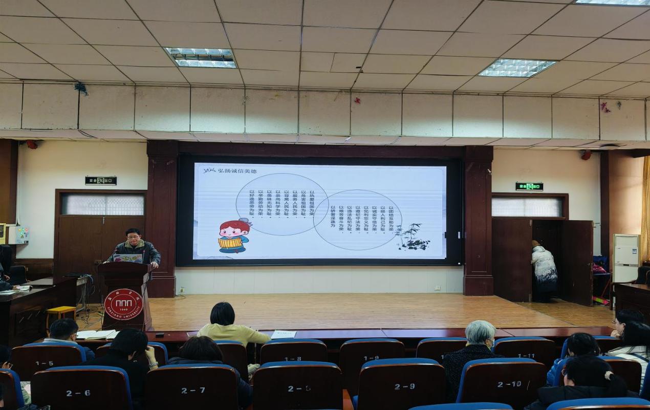 接着,赫兴无老师深刻阐述了诚信在人生与社会中的核心价值。赫老师讲学贴切,情感真挚。如赫老师以“烽火戏诸侯”,“曾子守信杀猪”,“商鞅立木取信”等几个经典故事为切入口,不仅点出失信的严重后果,还强调了诚信教育的深远意义。赫老师还通过分享自身的经历与感悟,向师生们展示了诚信如何在复杂多变的社会环境中成为一个人的立身之本,进一步凸显了诚信对个人品德修养的不可或缺性。最后强调诚信不仅是一种道德准则,更是一种生活态度,呼吁大家要在日常生活中以诚待人,用实际行动践行诚信的价值。