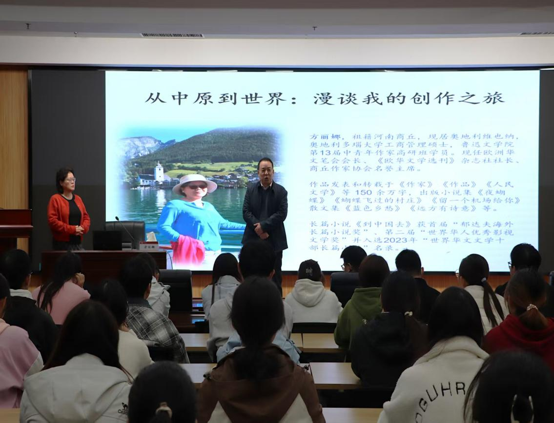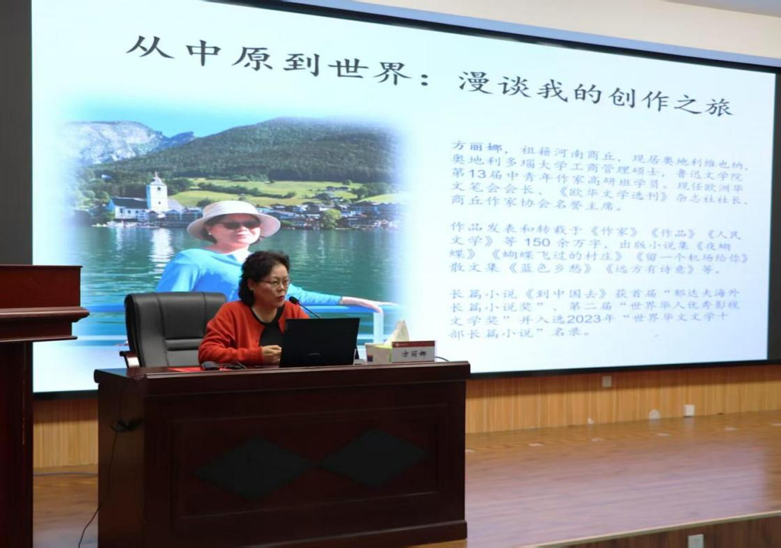 2025年10月22日上午,欧洲华文笔会会长、《欧华文学选刊》杂志社社长、商丘作家协会名誉主席方丽娜在行政楼一楼东报告厅为公司师生做了一场题为“从中原到世界:一个旅欧作家的文学创作之路”的文学创作专题讲座。讲座由公司党委书记、经理李金玉教授主持。beats365中文官网部分教师、公司朝月文学社社员、beats365中文官网“新荷作家班”成员和院刊“文韵”负责人等100余人参加了讲座。