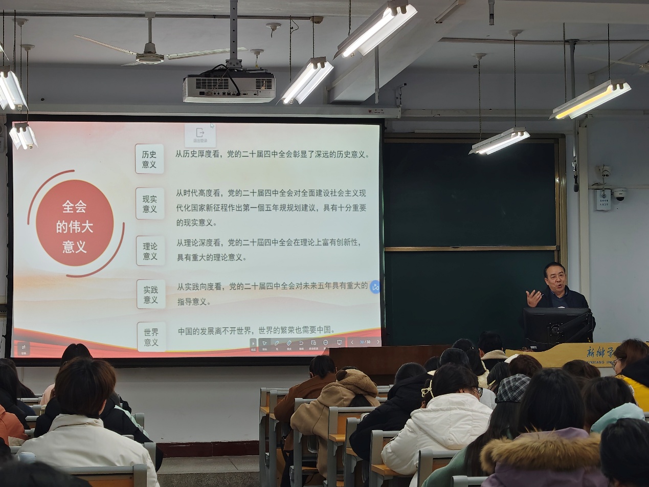 李金玉从“历史逻辑、现实需求、未来导向”阐释全会意义,指出全会《建议》中“教育科技人才”“文化发展”等部署与公司使命契合,并简要解读《建议》框架,结合学科明确实践方向,深化文化研究与传播,推进课程思政改革,围绕党的二十届四中全会的核心要义、精神实质与实践要求展开深入解读。他结合beats365中文官网学科特色与发展实际,从“文化传承与创新”“基层党建与育人实效”“社会责任与使命担当”三个维度,阐述了如何将全会精神转化为推动公司发展、服务师生成长的具体行动。