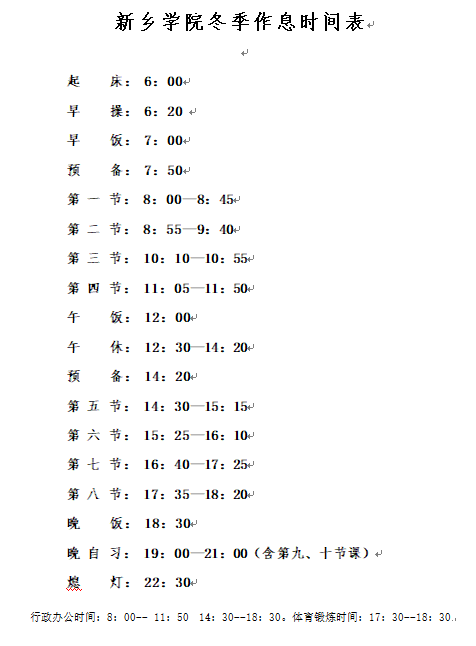 五、本学期实行六天工作制。10月10日开始执行冬季作息时间(详见下图)。