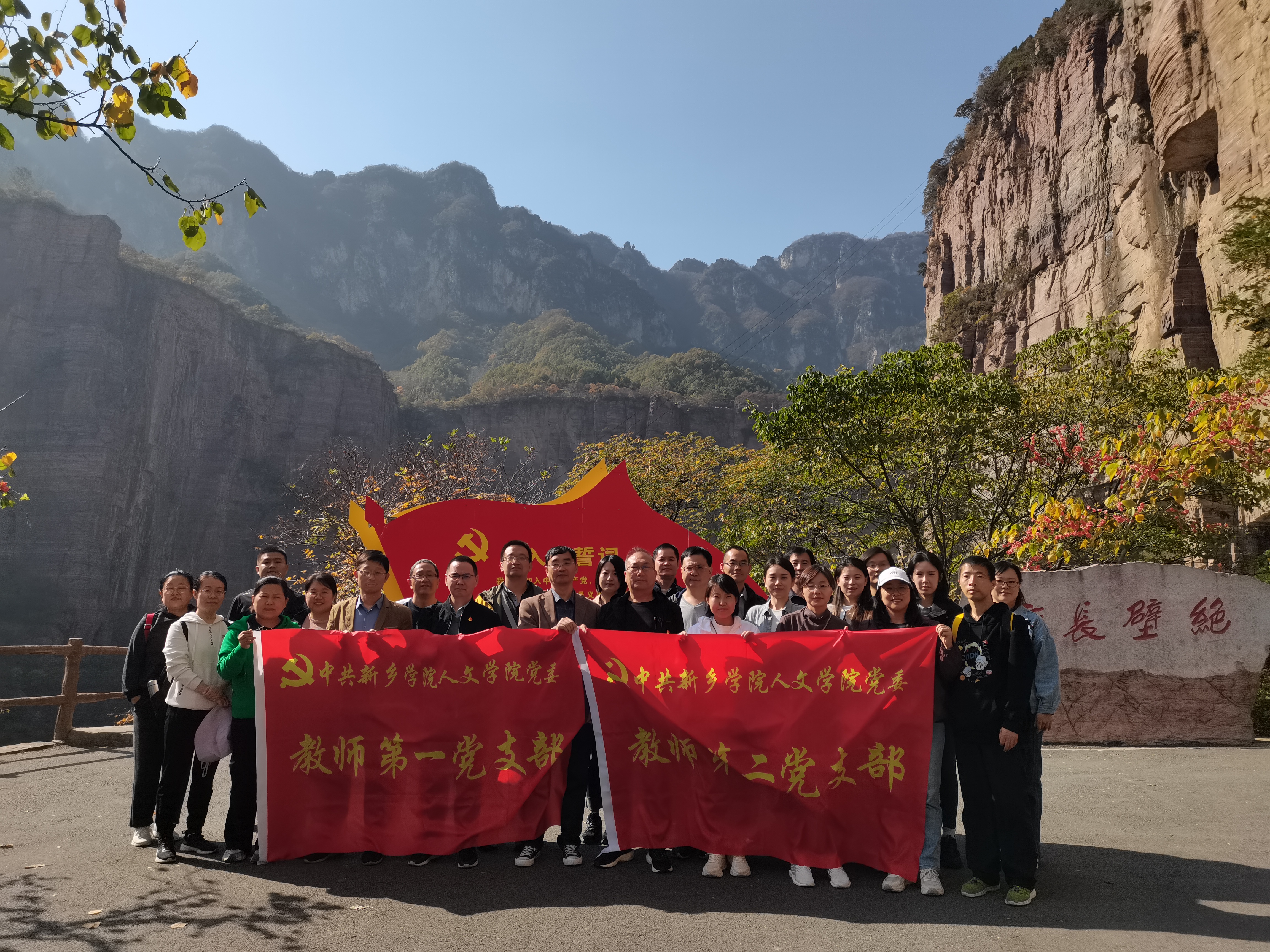 在郭亮村挂壁公路,beats365中文官网教师党员集中学习了13位太行勇士不畏艰险开山凿路的英雄事迹,震撼于辉县人民建设家乡、改变家乡的铮铮誓言与坚强意志,感动于辉县人民“担当精神、实干精神、苦干精神、创业精神”,激发了大家干事创业的热情。