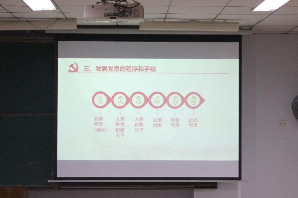 首先,陈卓老师介绍了发展党员的总要求,扩展了同学们对成为党员过程的认知。接着,陈卓老师从党的建立与发展、制胜法宝、入党动机等多个方面出发,讲解了端正入党动机的原因、途径以及需要注意的问题,结合视频详尽地向同学们介绍了党员发展的各项流程。最后,陈卓老师特别强调,只有为了献身共产主义事业,更好的为人民服务才是正确的入党动机。课上,同学们认真听讲,态度端正。