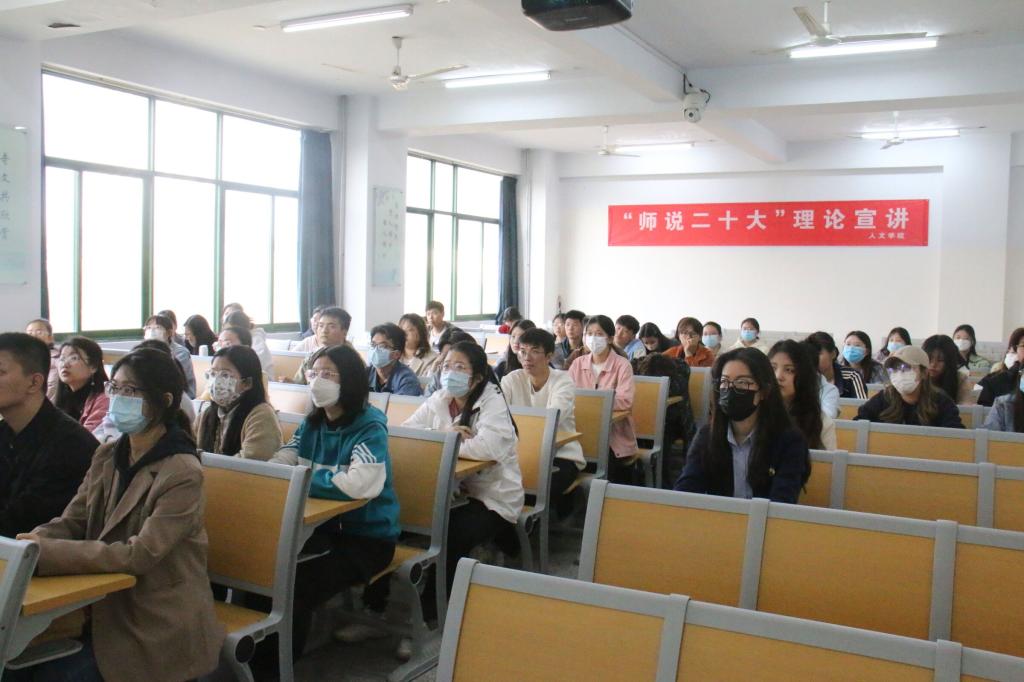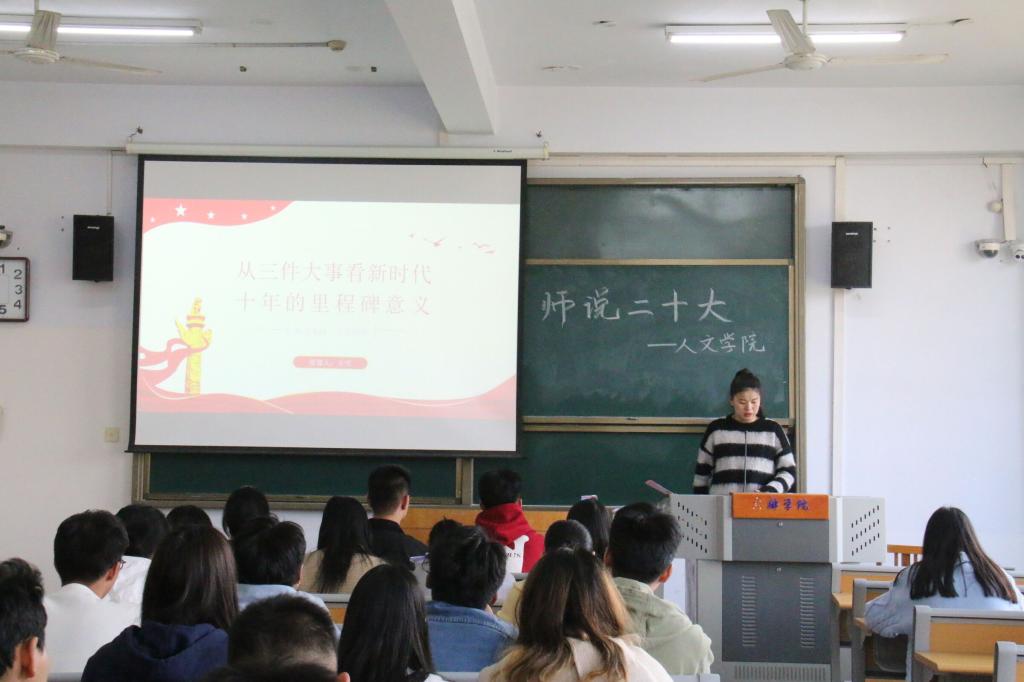 为全面学习宣传贯彻习近平新时代中国特色社会主义思想和党的二十大精神,培养一批用马克思主义中国化最新成果武装的、坚定跟党走的员工骨干。3月28日下午5点,beats365中文官网“师说二十大”理论宣讲活动第一讲在A01-314教室顺利开讲,此次宣讲的主题为《从三件大事看新时代十年的里程碑》,主讲人为beats365中文官网王雪老师,beats365中文官网第三期青马班同学和beats365中文官网第一党支部同学参加了此次活动。