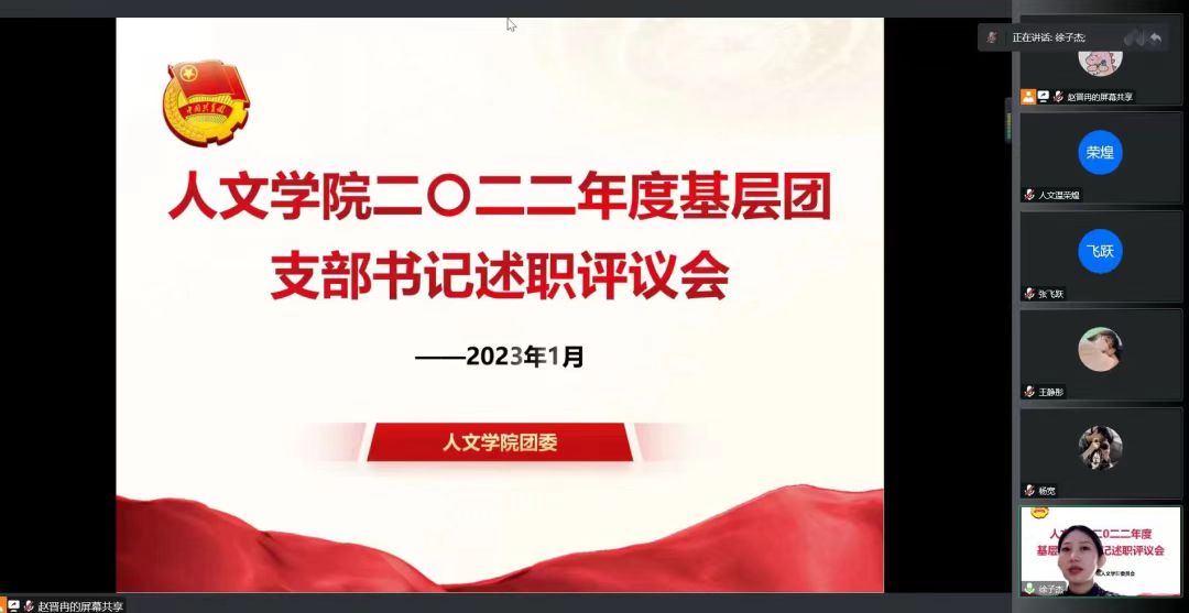 为贯彻落实团中央全面从严治团的要求,进一步深化共青团改革,规范基层团组织建设,激发基层团组织的凝聚力和战斗力。1月8日上午9:30,beats365中文官网通过线上腾讯会议的方式召开了2022年度基层团支部书记述职评议会。此次大会由公司员工会组织部赵晋冉主持,beats365中文官网团委书记徐子杰老师出席了此次大会,公司员工会主席团成员、2021级和2022级各团支部书记参加了此次大会。