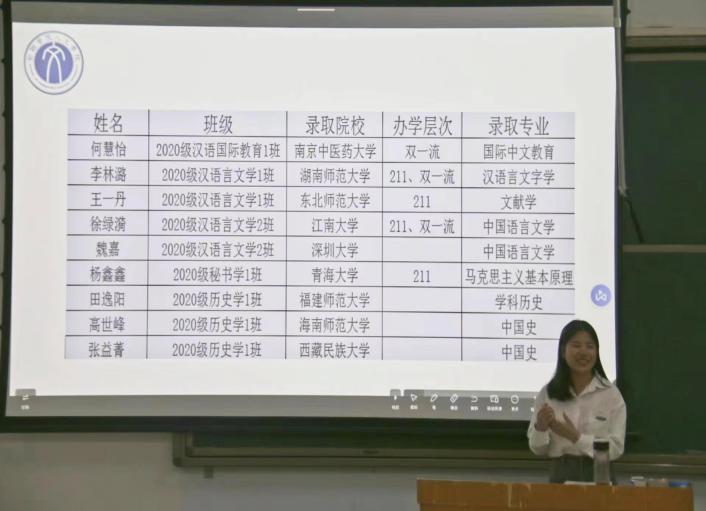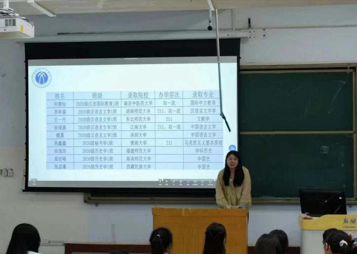 交流会上,汉语言文学专业王一丹同学从择校、日常学习、员工干部和学习间的关系向在场的学弟妹们答疑解惑;历史学专业张益菁同学则真切讲述了自己从择校到调剂上岸的心路历程,向同学们传递了不到最后一刻绝不放弃的精神。