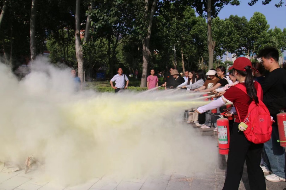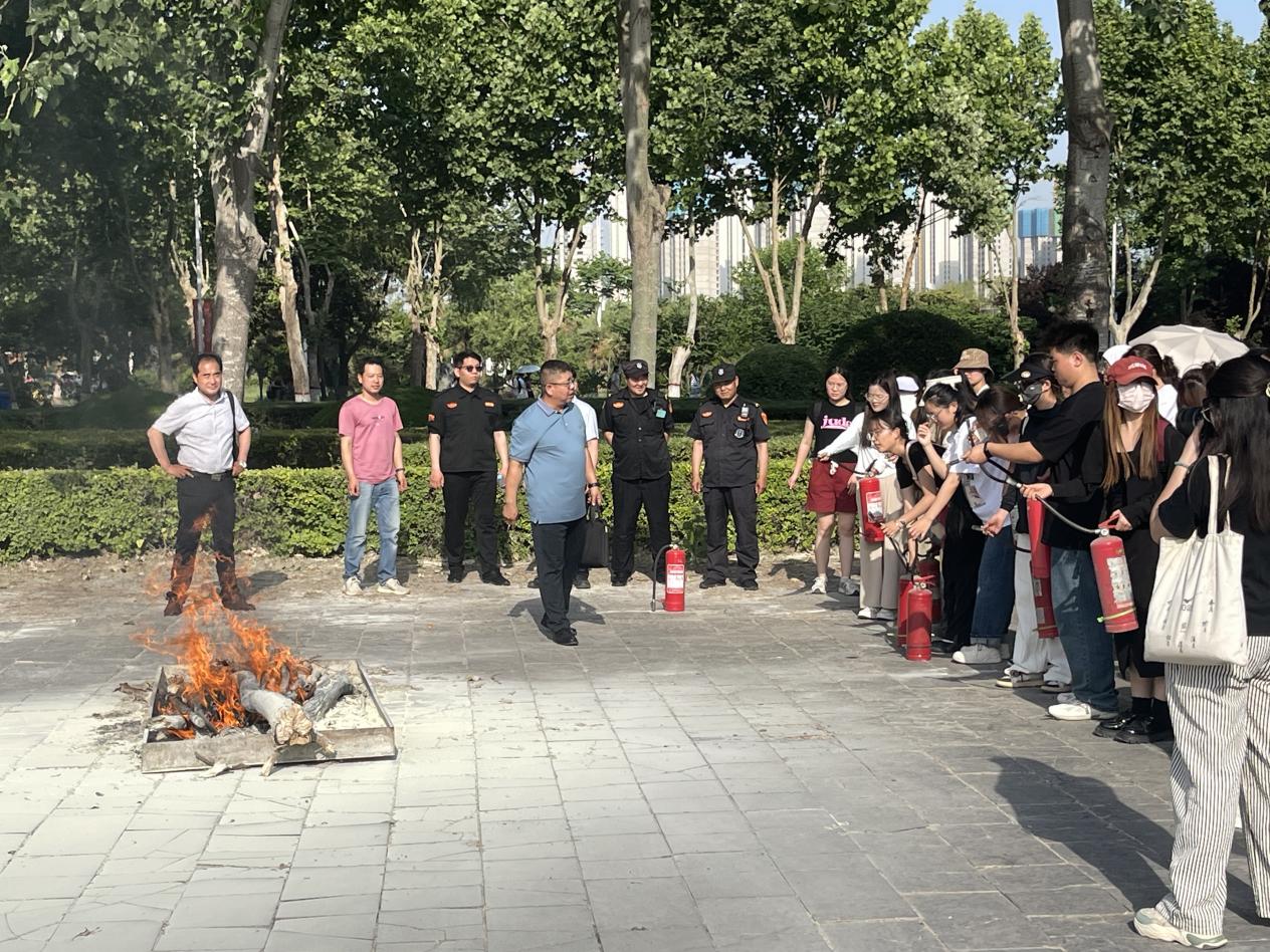 理论讲解结束后,随着模拟火警铃声的响起,紧急疏散演练正式开始。在公司老师的指导下,员工们迅速有序地从教室内撤离至空旷区域。随后,全体师生前往博雅广场,在保卫处老师的带领下,实际操作了干粉灭火器,并成功将火苗扑灭。