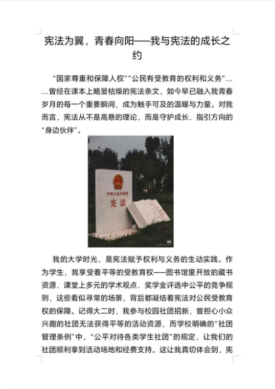 活动启动后,全院各班级员工积极响应、踊跃参与,纷纷以图文、视频等形式定格对宪法的理解与尊崇。在创作过程中,同学们跳出理论说教的框架,将宪法精神与校园生活、社会观察、个人成长紧密结合:有的以图文作品绘制宪法对青年权利的保障图谱,用生动笔触展现宪法与日常学习生活的紧密关联;有的通过心得随笔与影像叙事结合的方式,分享自身在学法、懂法、用法过程中的成长与蜕变。作品内容兼具思想深度与情感温度,既体现了青年学子对宪法内涵的深刻领悟,也展现了新时代青年尊法、信法、守法、用法的自觉意识。