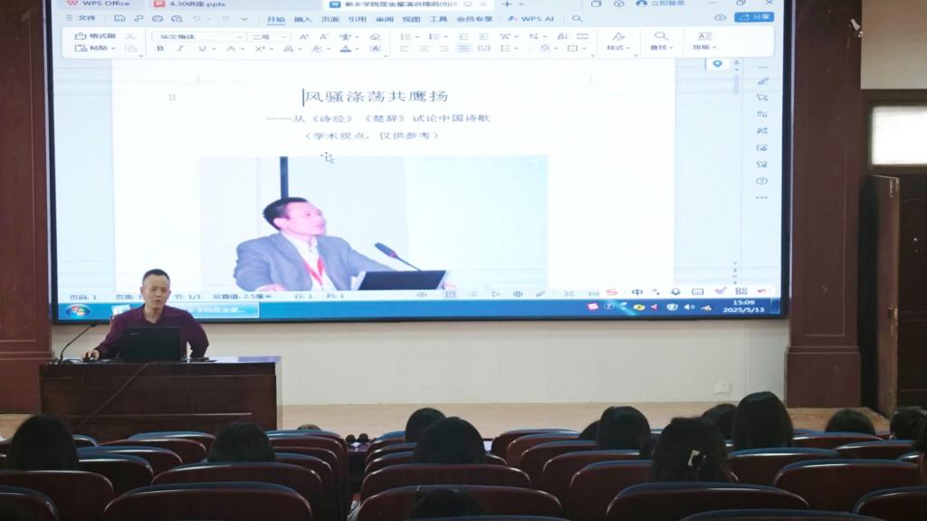 屈金星围绕讲座主题,从中国诗歌的双源、诗歌美学与形式的对比、双源传统对后世诗歌的影响、诗歌传统的当代价值四个方面展开讲述。他结合自身创作经历与研究成果,分析了《诗经》与《楚辞》在文化内涵、艺术风格上的差异,阐述了两者共同构筑的中国诗歌传统及其对后世的深远影响,引导师生感受古典诗歌的魅力,思考传统诗歌在当代的传承与价值。
