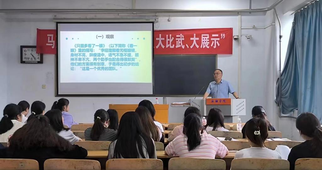 首先,杜毅文老师为大家介绍了中国作家协会、河南省作家协会以及新乡市作家协会的相关组织架构,讲述了老员工加入新乡市作家协会的途径方法。接着,杜老师介绍了自己的写作经历,并结合自身创作经验,从观察、感觉、情节、素材、创新、阅读等七个方面指导同学们应该如何进行文学创作。在讲述如何观察时,他通过让同学们猜测自己职业的方式,将观察方法更加生动直观地展示出来。他强调,同学们既要学会融入大自然,深入日常生活观察、捕捉写作素材,也要多读书,读好书,从阅读中获取丰富的经验。最后,杜老师向大家介绍了新乡市优秀作家的代表作品,讲述了他们对文学创作的热爱以及普通人依靠写作改变人生轨迹的励志故事。