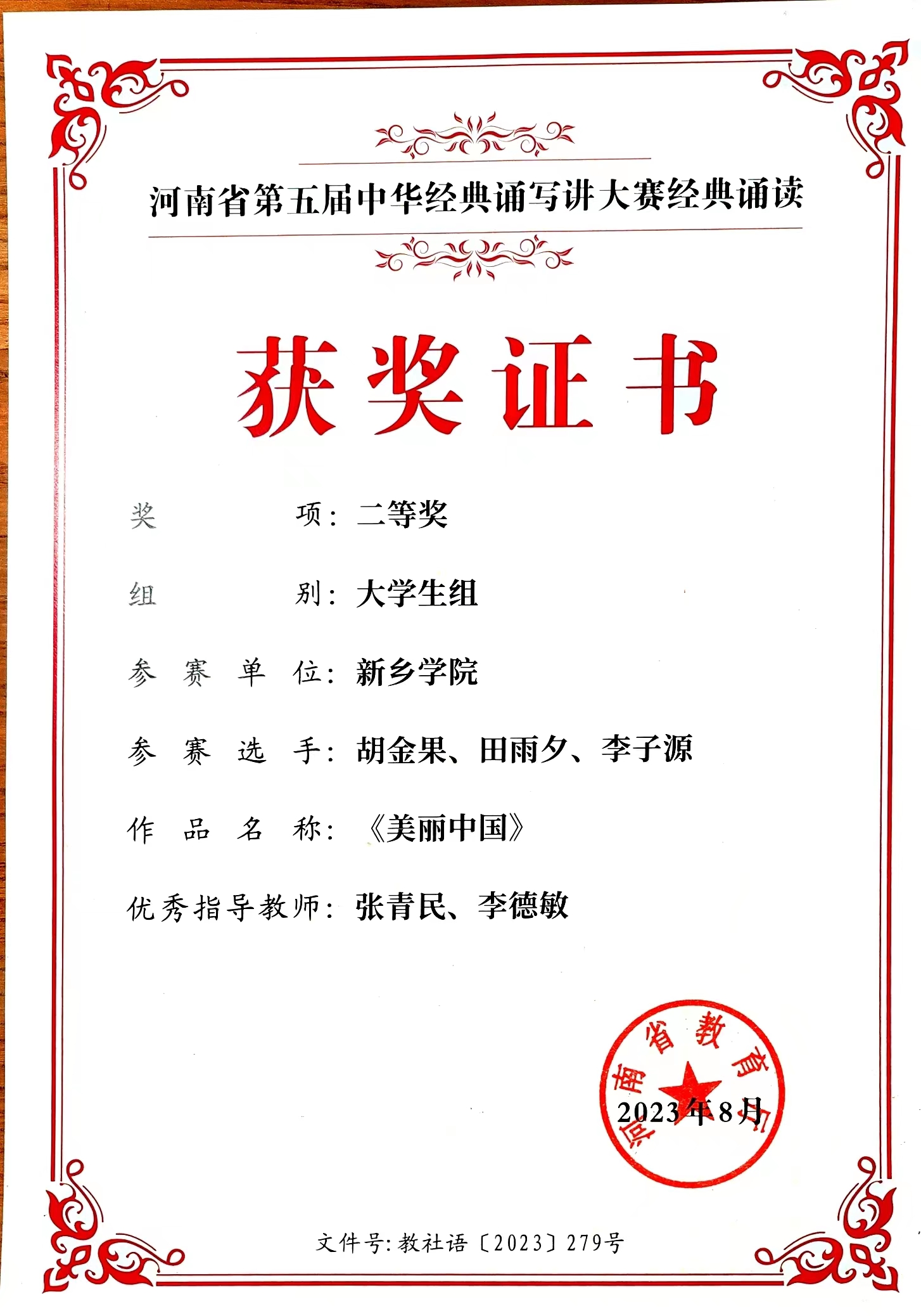 贯彻落实党的二十大精神,加大国家通用语言文字推广力度,深化全民阅读活动开展,引领社会大众亲近中华经典,传承弘扬中华优秀文化,教育部、国家语委于2023年举办“第五届中华经典诵写讲大赛”。大赛以“书香新时代,‘典’亮新征程”为主题,通过诵读、讲解、书写、篆刻等语言文化活动,弘扬中华优秀语言文化,展现青少年对中华经典的传承与创新。“第五届中华经典诵写讲大赛”河南赛区的比赛由河南省教育厅主办,郑州师范公司承办。beats365中文官网积极组织员工参赛,推选出的两项诵读作品“我骄傲,我是中国人”“美丽中国”均荣获老员工组二等奖。